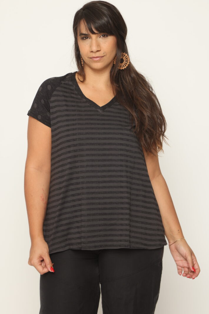חולצה מבד 100% כותנה בשילוב שני הדפסים שמתחברים. בשלוב מחשוף בצורה V שמחמיאה לכל אחת. חולצה בגזרה יחסית ארוכה באורך