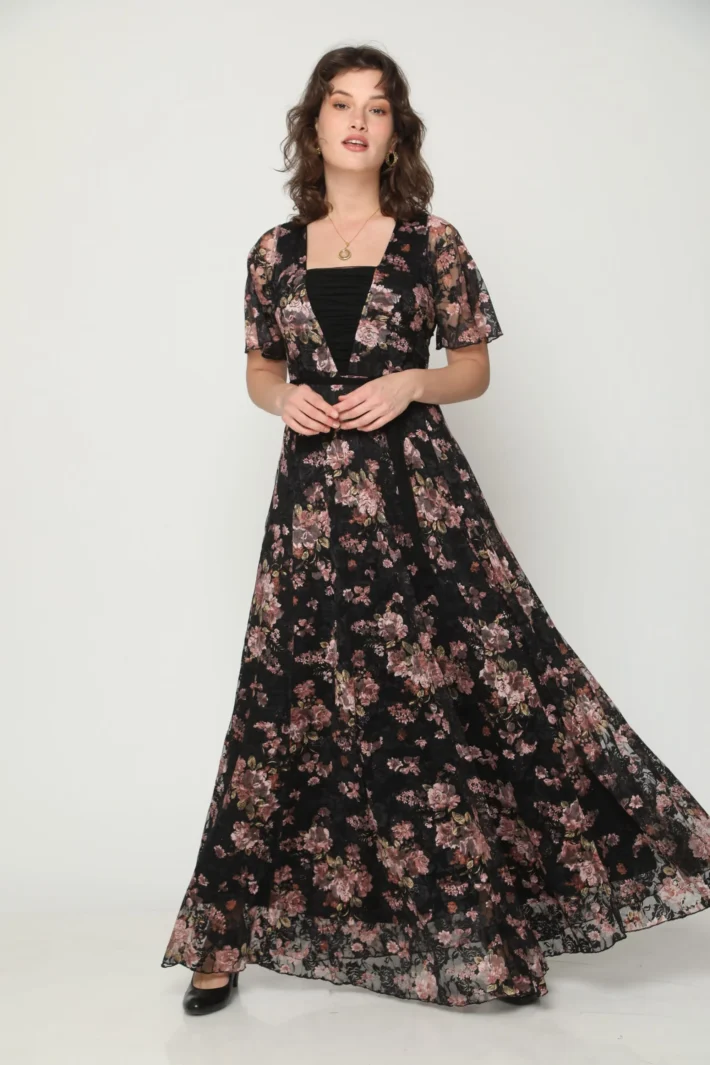 שמלת ערב פרחונית מבד תחרה, עם בד ביטנה נעימה לגוף מבד נאון.